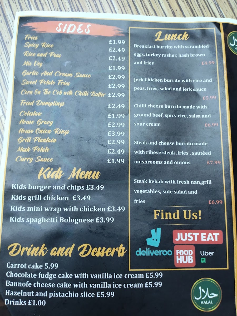 The menu features a range of flavorful burritos, including the Jerk Chicken and Chilli Cheese, each crafted with fresh ingredients and a perfect balance of spices. Not to be missed are their delightful sides like Spicy Halloumi Fries and Jerk Prawns, which elevate the dining experience. Sweet cravings? Indulge in their mouthwatering desserts, from Chocolate Fudge Cake to Bannoffee Cheesecake, making every meal memorable.